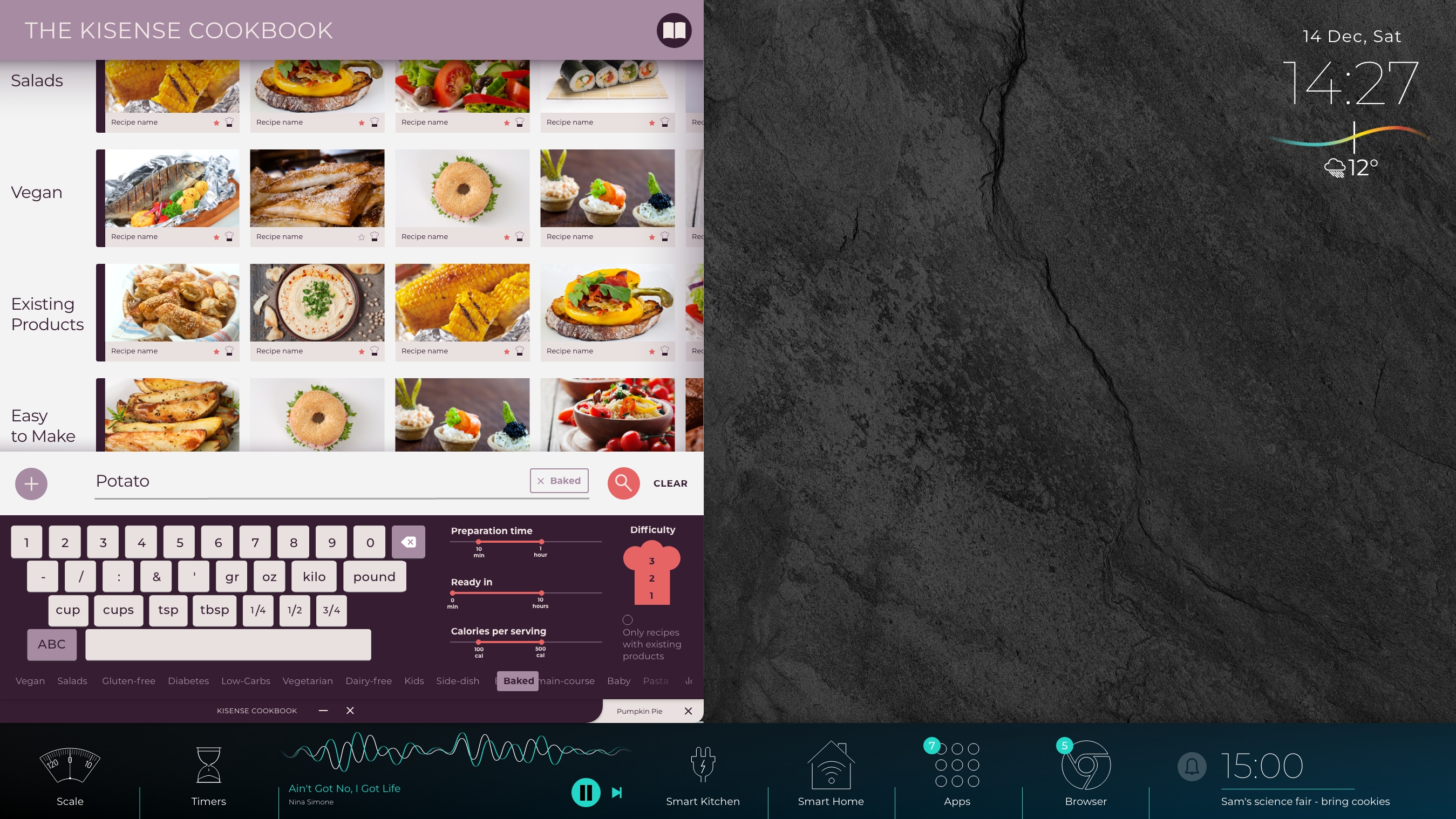 Multi-touch - allowing for several simultanious users, All directions - turn an app window to face you at any side of the device & Multi-user - a shared device allows to easily switch between accounts and preferences so that whoever is cooking can set the tone.